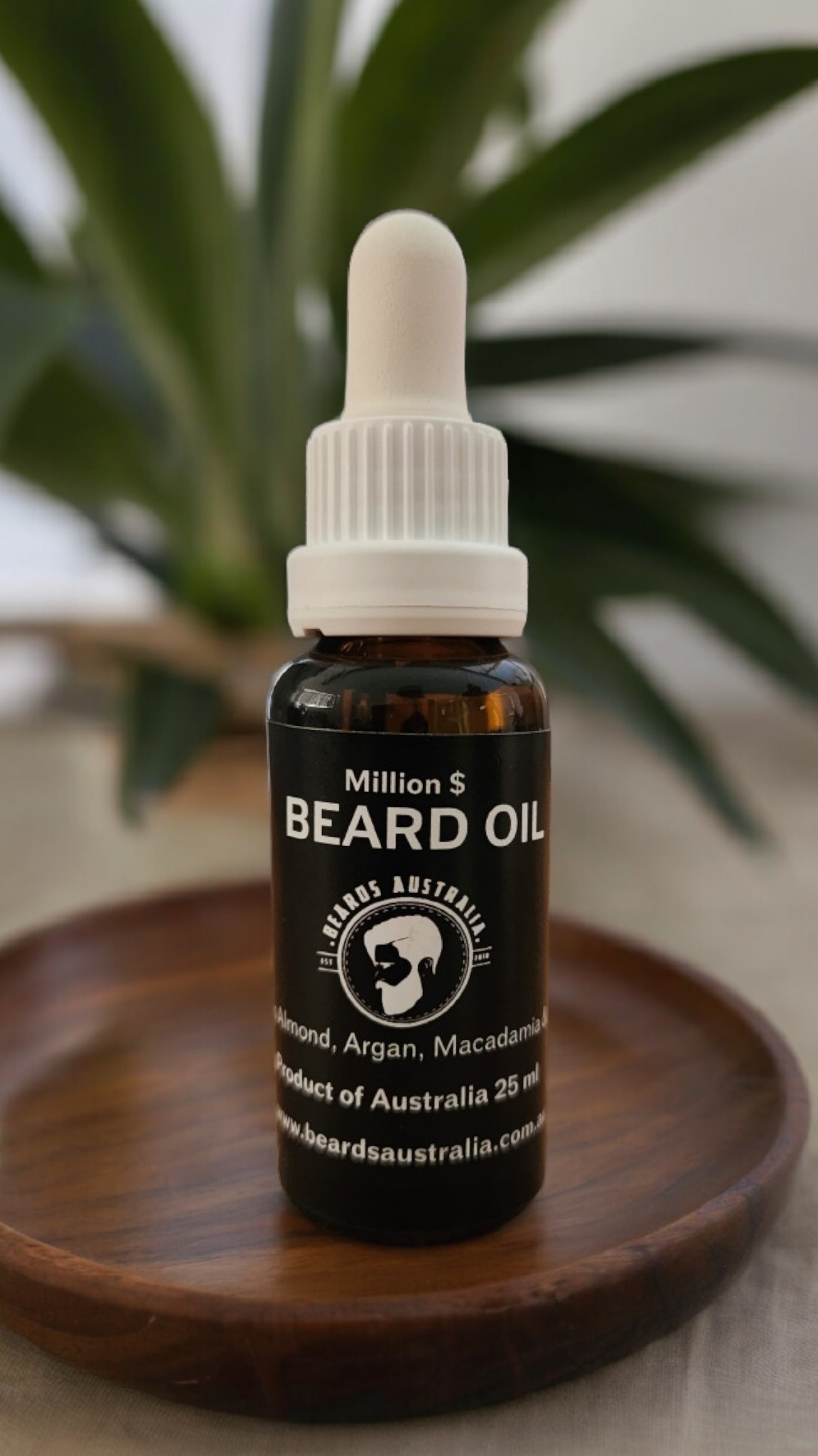 Natural Beard Oil Fragrance Million $, in a 25 ml bottle. This lightweight Beard Oil will help soften and nourish the follicles on the skin & beard. Our beard oil is hand-poured in Australia and packed full of natural ingredients containing Almond, Argan, Macadamia & Jojoba oils. Here at Beards Australia, we pride ourselves on using the best natural oils available to moisturize & help keep your facial hair healthy. The fragrance is Million $, very classy, and our most popular seller. Â